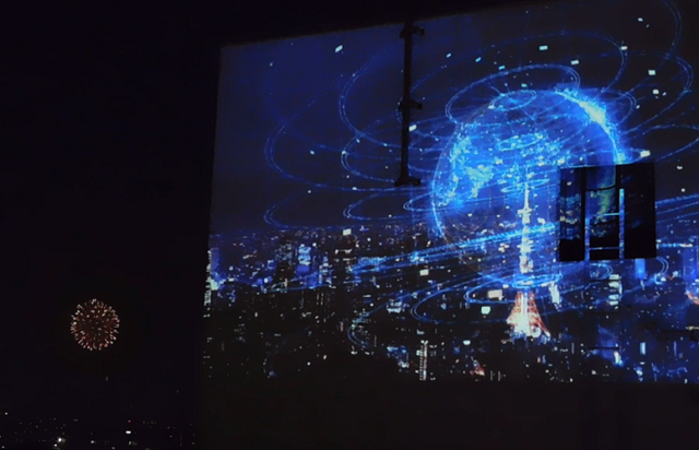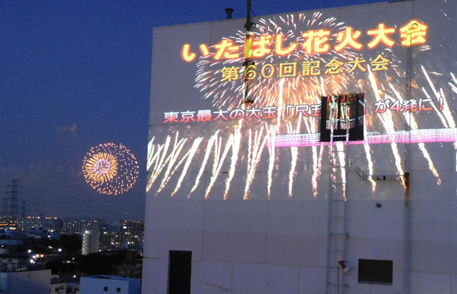 花火大会に合わせて、ビル搭屋へ企業PRも含めてのプロジェクションマッピング投影を行いました。